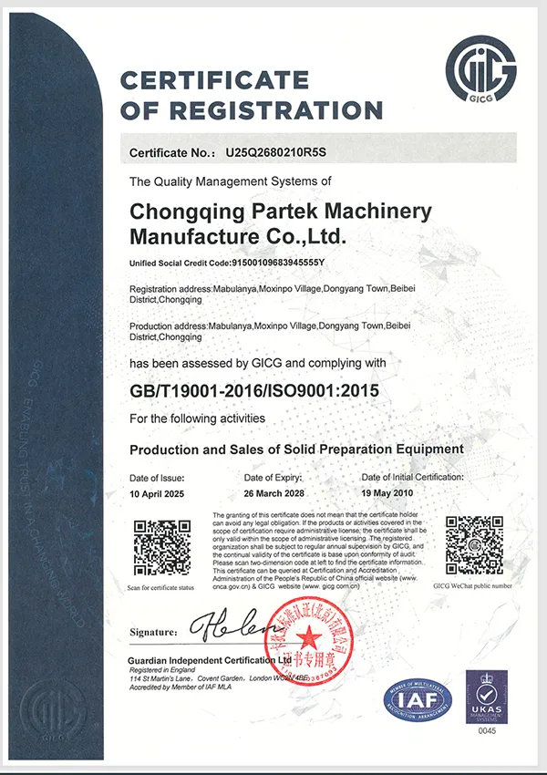 Certified to ISO 9001:2008 Quality Management System; received the CMD China Professional Manufacturer Certificate, became a member of the China Association for Pharmaceutical Equipment (CAPE), successfully registered the Partek trademark